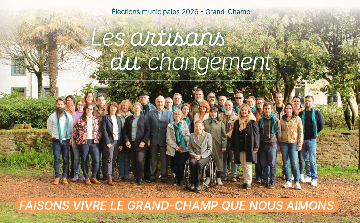 Depuis plusieurs mois, nous avons travaillé sans relâche pour vous rencontrer, recueillir vos attentes et vos aspirations pour Grand-Champ. Vous nous avez remonté vos espoirs, une envie partagée de bien vivre à Grand-Champ et de voir évoluer notre commune. Vous nous avez dit aussi attendre de vos élus de la sincérité, de la transparence et une écoute concrète des habitants tout au long du mandat.